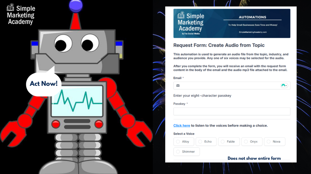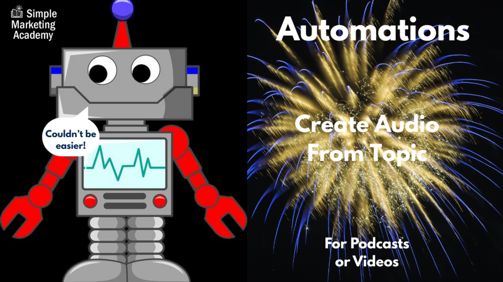 This automation generates an AI-created audio (mp3) file based on the topic you provide. You can choose from six voices (4 male, 2 female) and preview them via a link. The content is limited to 4,096 characters, though this limit is unlikely to be exceeded. If it does, you're advised to try again.