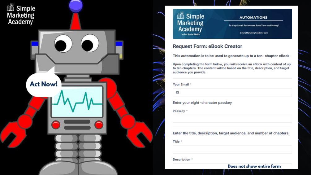 This automation generates customized eBooks tailored to users' specifications. Users input their email address, desired title, description, and target audience, then select the number of chapters (3-10) and customize the writing through options for reading level, style of voice, and tone of voice. The system generates a complete eBook tailored to these parameters and delivers it as a PDF file via email attachment, providing a comprehensive digital publication ready for distribution or use.